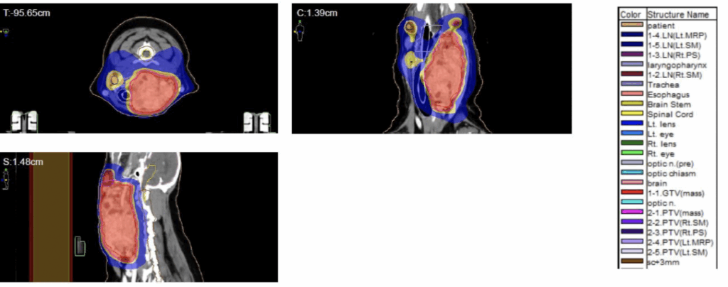 CT 검사 및 세침흡인 검사를 진행한 결과, 갑상선 유래 종양이 의심된다는 소견을 받았습니다. 갑상선 종양은 본래 수술이 1순위로 고려되나, CT상 경동맥, 경정맥, 주변 신경 등 주변 조직에 침습되어있어 수술 위험도 높아 방사선 치료로 선택하였습니다.