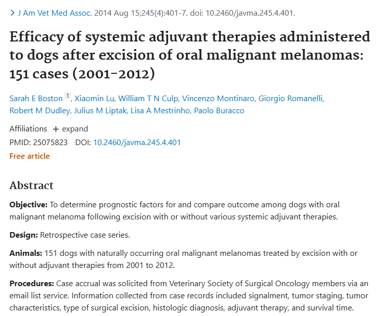오늘은 강아지 구강에서 가장 흔히 발견되는 악성 종양인 구강 흑색종(oral malignant melanoma, OMM) 에 대해 말씀드리려 합니다. 이 질환은 조기 전이와 국소 침습으로 인해 예후가 불량한 종양으로 알려져 있으며, 보호자분들의 선택 고민이 많은 종양 중 하나입니다. 이번 글에서는 구강 흑색종의 특징과 치료법별 연구 결과를 비교해보겠습니다.
