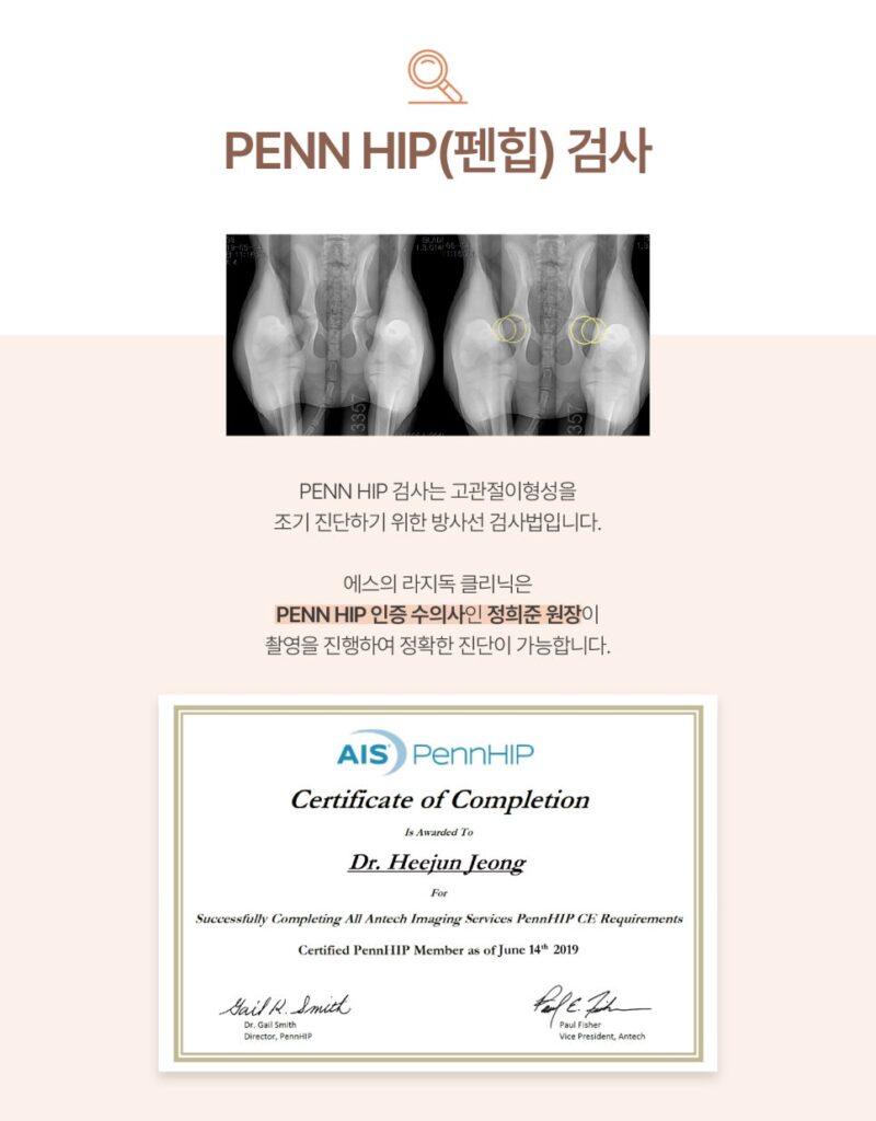 펜힙검사(Penn HIP)는 기존 방사선 촬영으로는 어린아이에서 고관절 질환의 조기 진단이 불가능한 점을 보완하기 위해 개발된 방사선 촬영법입니다. 주관사인 AIS에서 강의를 듣고 테스트에 통과한 수의사에게 인증서가 발급됩니다.