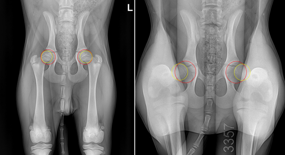 골두가 들어가는 골반의 관골구에 빨간색의 가상의 원을 그리고 허벅지뼈의 골두에 가상의 원을 그린 후 노란색원이 빨간색원에서얼마나 빠져있는지 평가를 합니다. 같은 아이의 방사선 영상인데도 두 영상의 차이가 극명하게 드러납니다.
