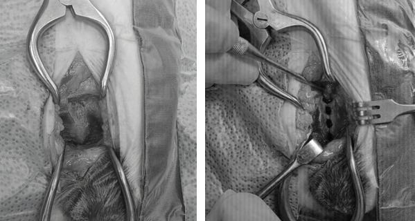 골반의 치골을 노출시킨 후 전기 소락기를 이용하여 성장판의 절반정도를 손상시킵니다. 위 사진 오른쪽에서 보이는 4개의 구멍이 손상시킨 성장판 부위입니다. 수술은 1시간만에 종료되었습니다.
