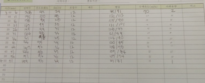 마취중 마취 통증 전공 수의사가 기입한 마취기록지 입니다. 수술 중 지속적인 바이탈체크로 마취사고를 최소화합니다