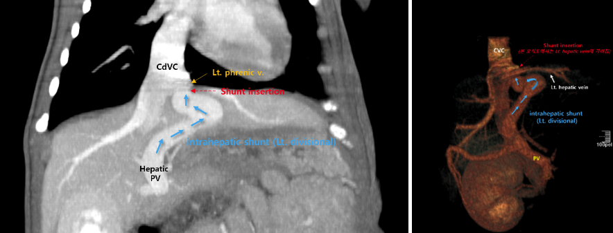 CT촬영 결과 간 좌측 내측엽에서 대정맥으로 유입되는 이상혈관(Shunt)를 확인하였으며, 간내성 문맥 전신 단락증 (Intrahepatic PSS)으로 진단되었습니다.