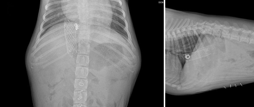 강아지 하대정맥에 장착된 스텐트와 이상혈관 내에 위치한 코일 / 출처: 에스동물메디컬센터