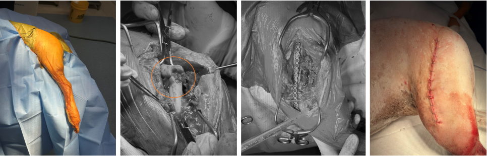 대형견 강아지 인공관절 수술 / 감염예방을 위한 술전 아이오반 필름부착 | 골절 된 대퇴골 플레이트를 이용한 골절 수복 | 수술 종료 후 수술부위/ 출처: 에스동물메디컬센터