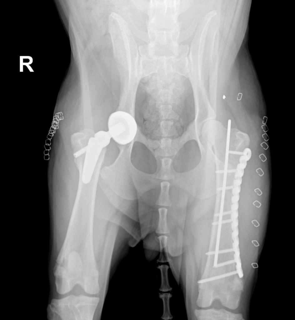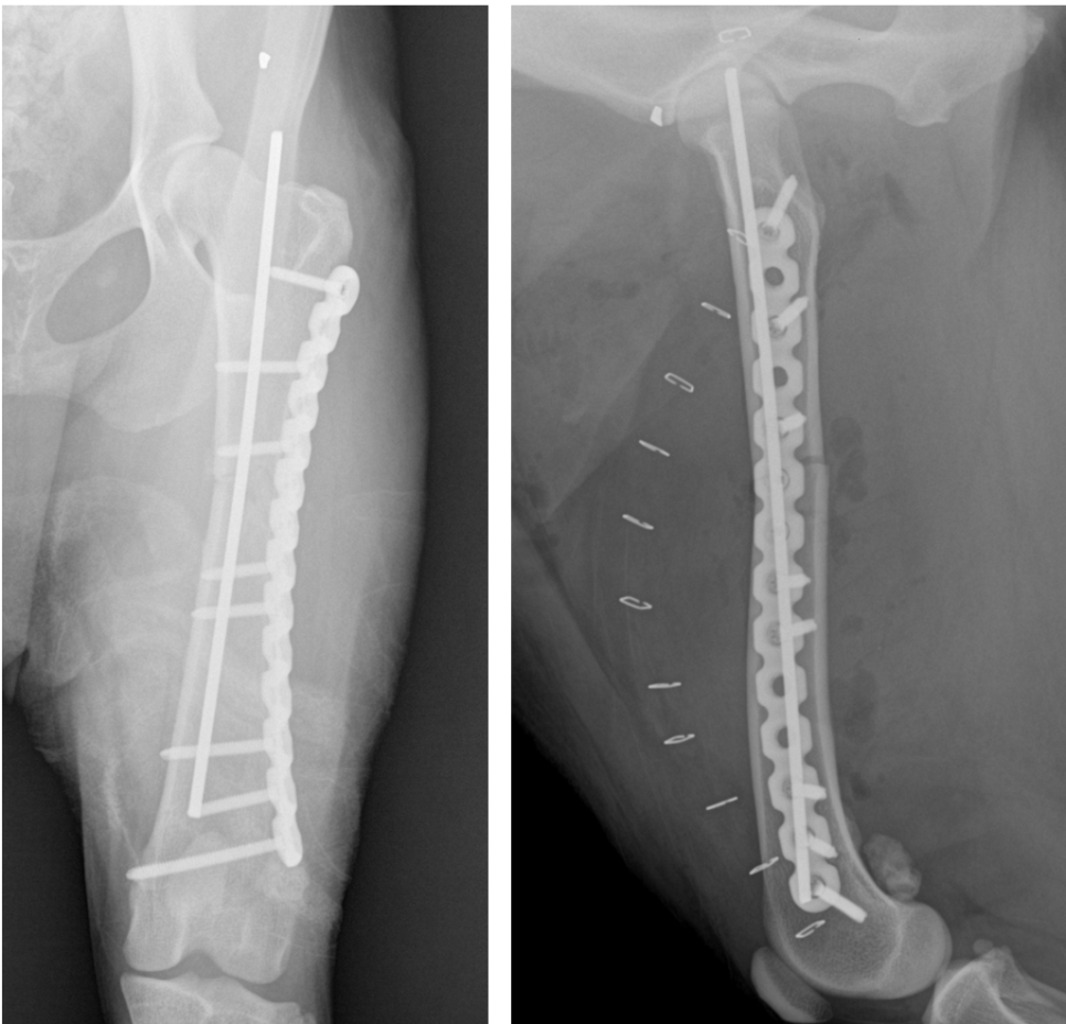 대형견 강아지 골절 수복 후 방사선 사진 / 플레이트와 IM PIN을 이용해 수복한 좌측 대퇴골 방사선 영상 / 출처: 에스동물메디컬센터