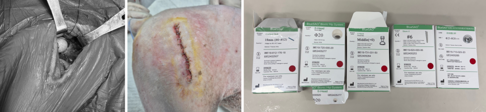 인공관절을 체내 장착한 모습 | 수술 종료 후 수술부위 | 실제로 사용된 인공관절 임플란트 / 출처: 에스동물메디컬센터 울산점