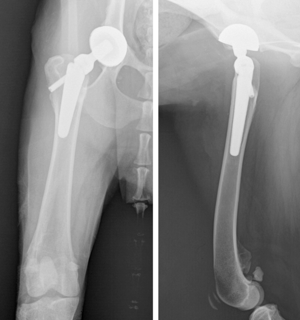 👉 적절히 관리되면 ‘평생 사용’이 가능합니다. 현재 사용되는 수의용 인공관절(THR) 임플란트는 티타늄 합금, 고분자 폴리에틸렌 컵, 골융착형 구조로 설계되어 있습니다. 대게 8~10년 이상 안정적으로 유지되는 것으로 보고됩니다.