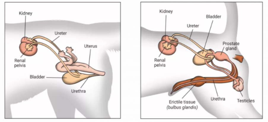 암컷(좌)의 경우 짧은 요도를 가진 반면에 수컷(우)의 경우 길고 180도 휘어진 요도 형태를 갖고 있습니다.
