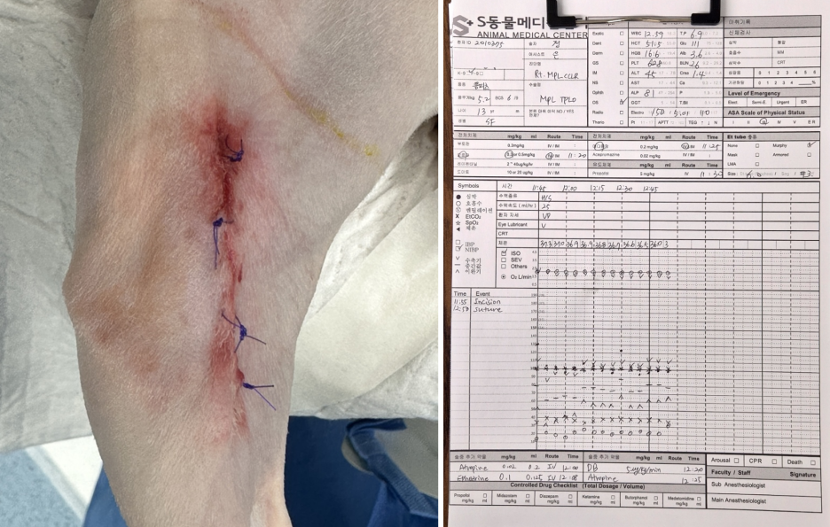 울산 에스동물병원 슬개골 십자인대 수술 후 봉합/최소절개 & 수술 마취기록 / 출처: 에스동물메디컬센터