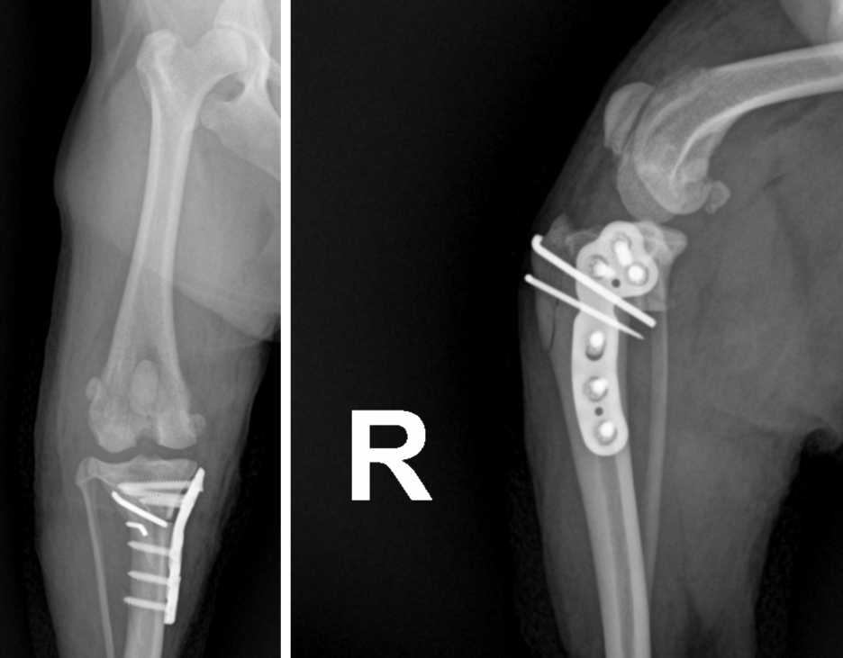 슬개골 탈구 및 TPLO 수술 후 정상위치로 환납된 슬개골과 TPLO 수술에 사용된 플레이트가 정확히 장착됨을 확인하였습니다.