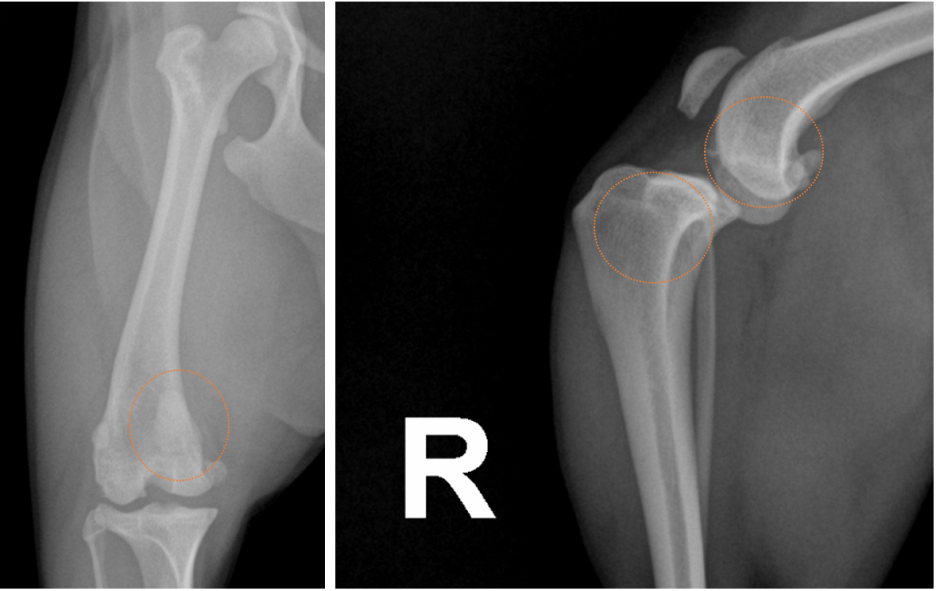 방사선 사진 상 안쪽으로 빠져 있는 슬개골과 무릎 관절 사이에 신생된 뼈 조직, 정상보다 전방으로 튀어나온 종아리뼈가 확인됩니다