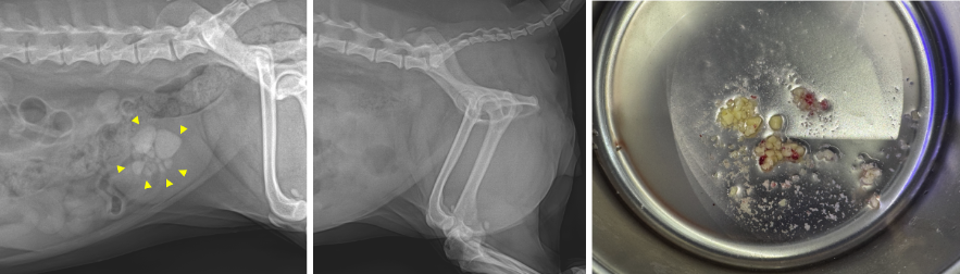 양산·부산 강아지 방광결석 수술 전(좌) / 수술 후 (중) / 레이져 파쇄로 조각나 있는 결석들(우) / 출처: 에스동물메디컬센터 양산점
